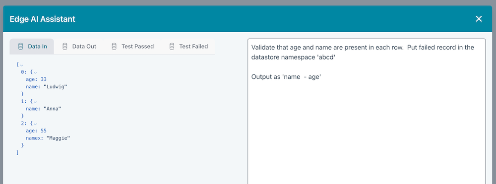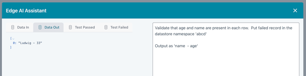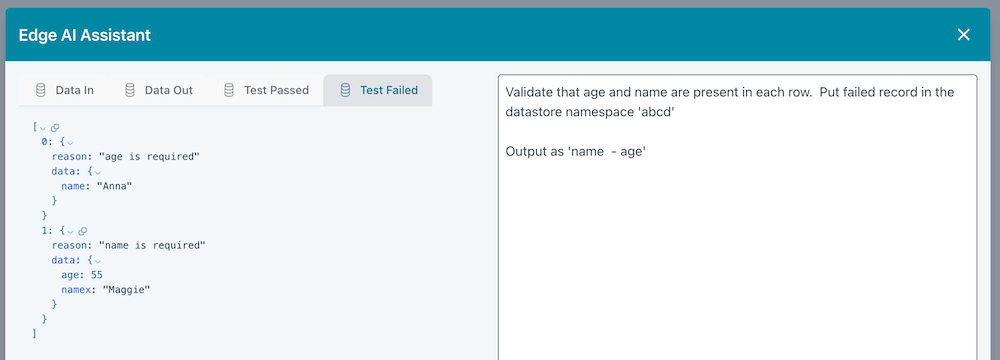 - Detailed validates each row of data on the edge and splits into passed and failed rows. The passed rows will be output. You should explicitly mention that you want row by row validation or provide some other instruction as in the above screenshot
