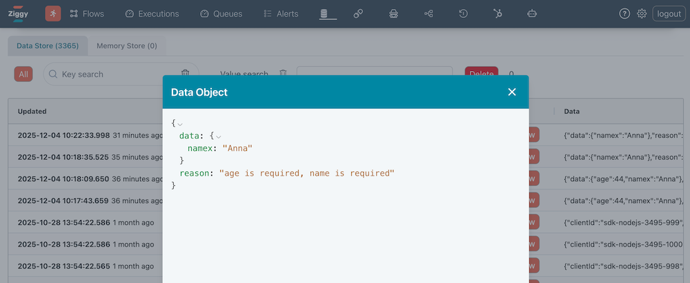 This will insert failed validations in the data store browser under the namespace abcd. You can then access this later within this flow or other flows however you like.