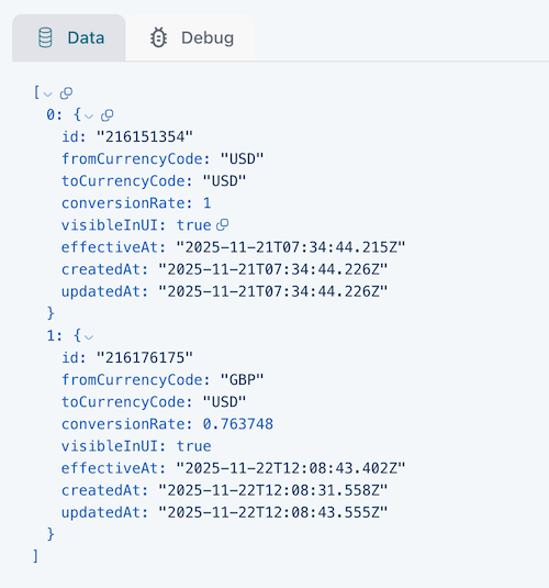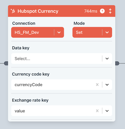 This retrieves all current HubSpot currencies and the current exchange rates. The data is placed on the output edge.
