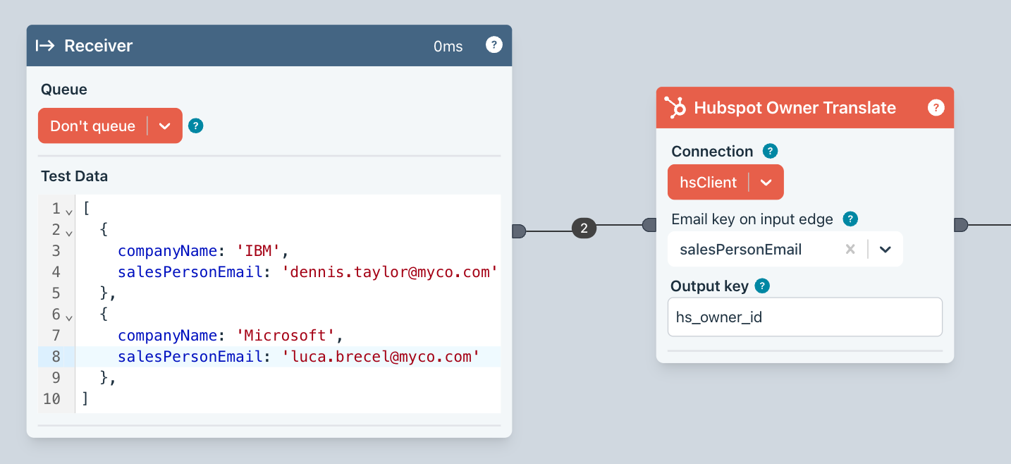 This output edge will contain the data on the incoming edge with the hs_owner_id added as a new key, if it was found in the lookup.