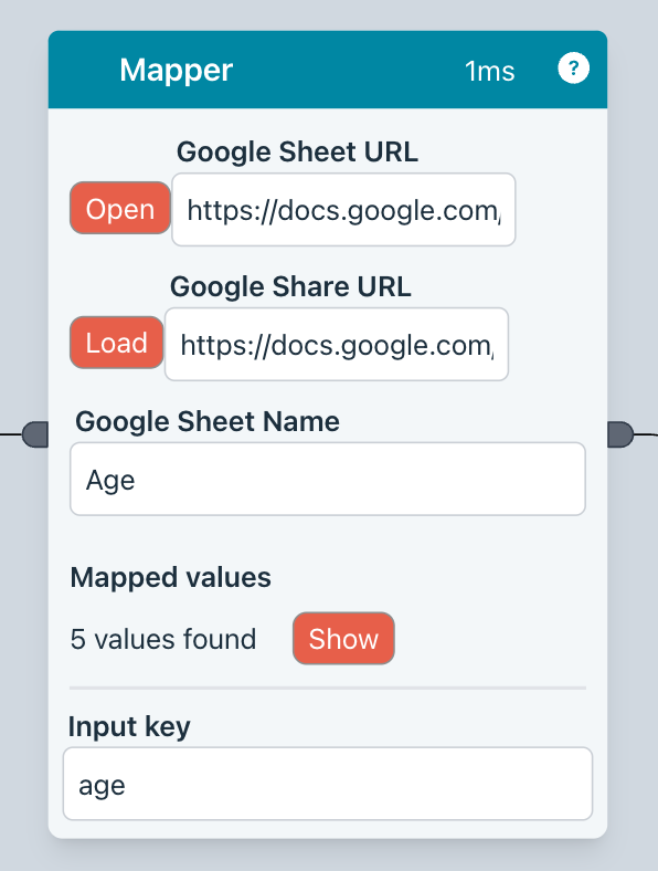 Maps value on the input edge from one value to another. Data can be read from the Google Sheet workbook/worksheet combination you enter.