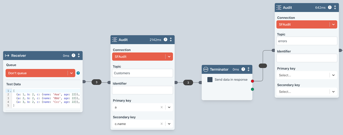 The Audit block allows you to write data to an external data source so a process auditor can track data at a point in time.