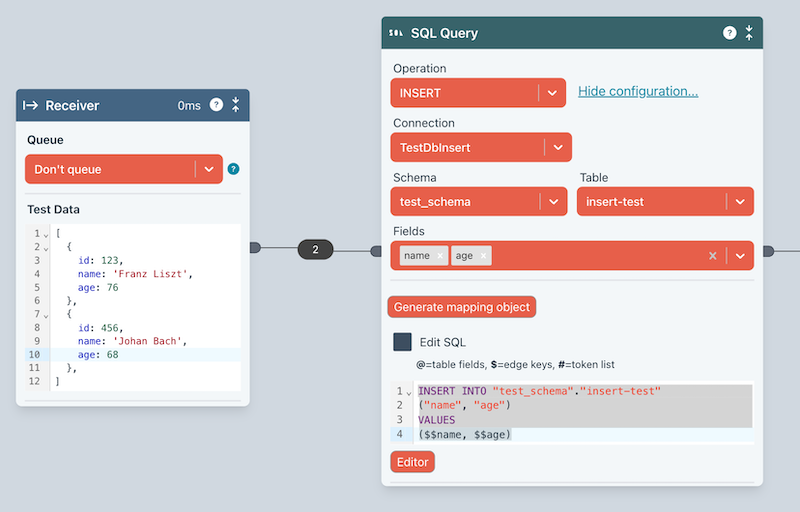 The example below, the imcoming edge will contain an array of two elements, each of which contains age and name. We've used the Receiver's test data to illustrate this.